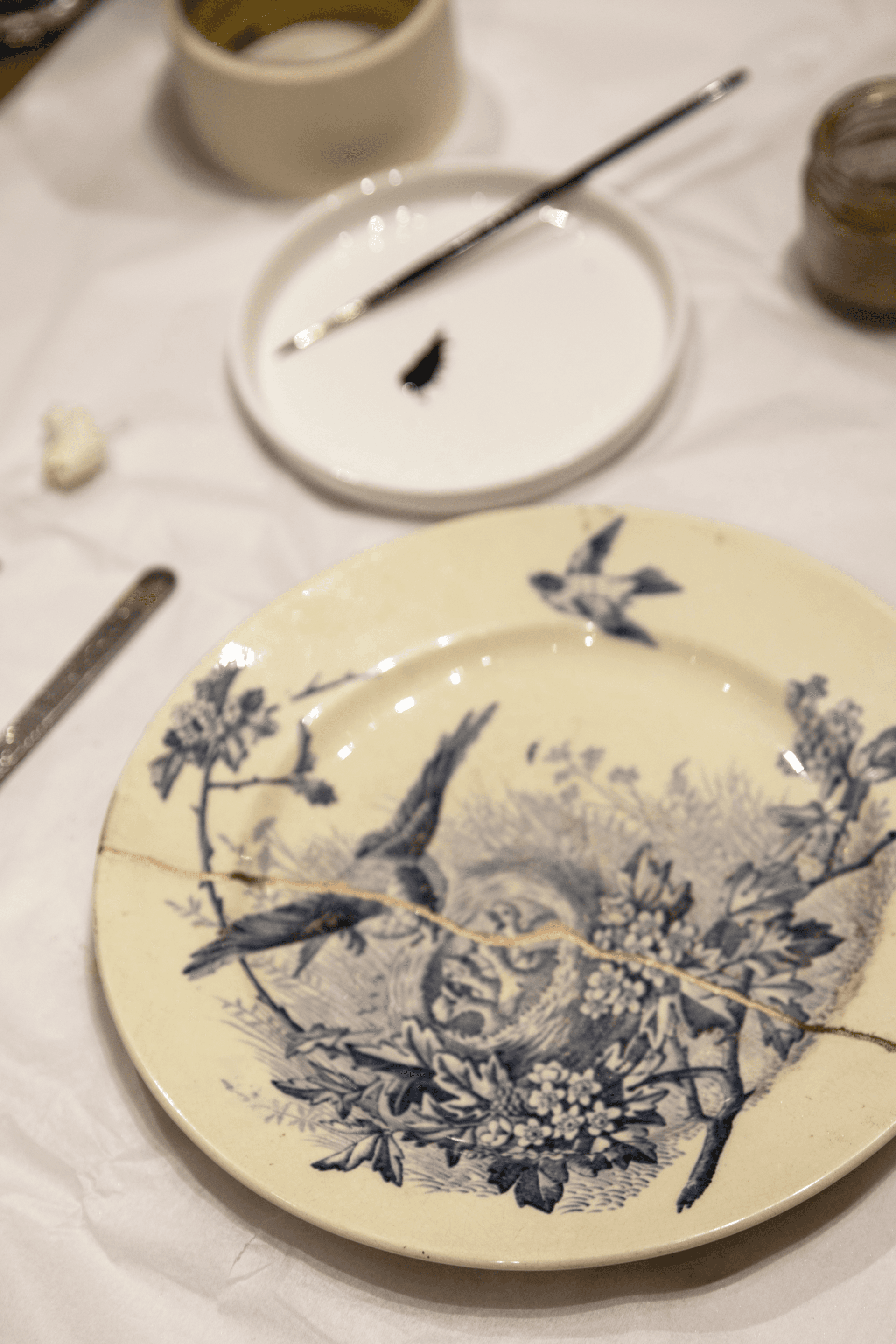 Kintsugi is the Japanese art of repairing broken pottery by mending the areas of breakage with lacquer dusted or mixed with powdered gold, silver or platinum.