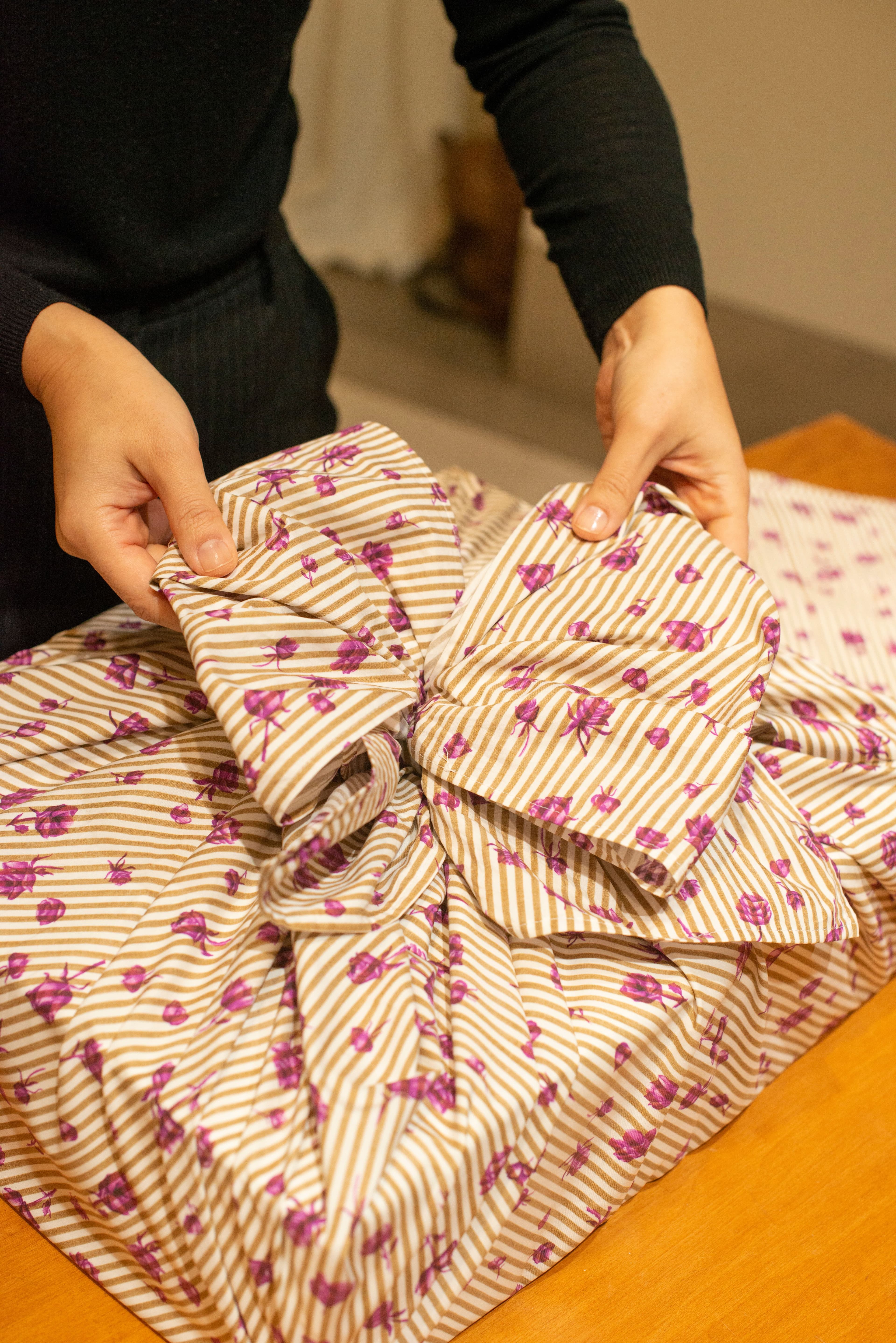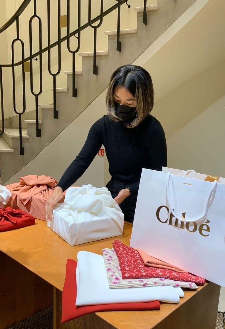 Since 2021, Cosi Tutti helps Chloé fashion house celebrate Christmas season in a sustainable fashion. Chloé's clients are offered to wrap their gifts using Furoshiki wrapping technique, an ancestral Japanese craft of folding textile to wrap goods, using fabrics from Chloé's previous collections.