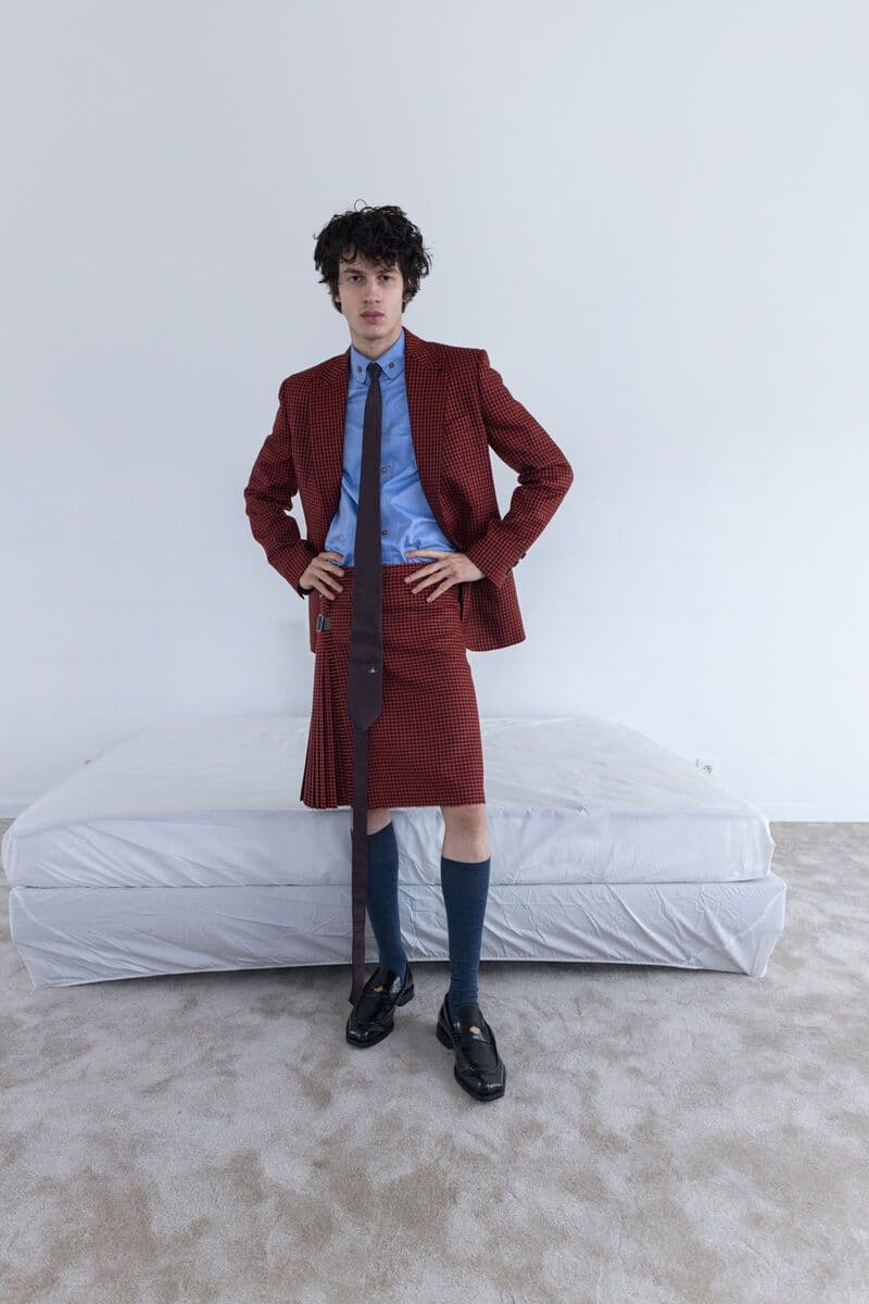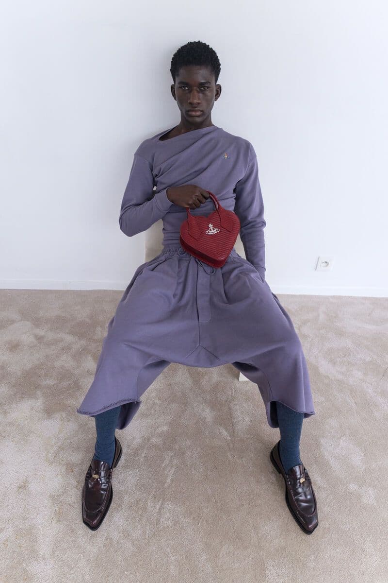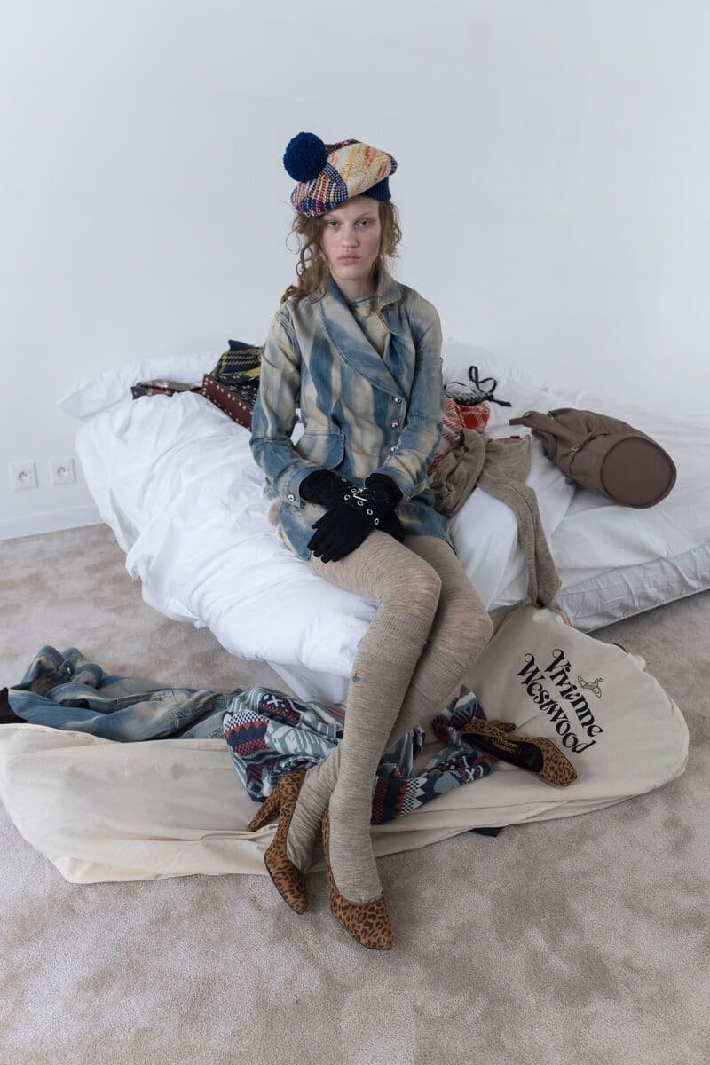 Shot in a stripped-back setting to let the clothes speak, the collection featured masculine shearling styled with Lochcarron tartan, quilted velvet fencing jackets and lace-up trousers in denim and serge. Each look told a story, rebellion, and sensual tailoring, with garments that felt worn, familiar, undeniably bold and unmistakably Westwood.